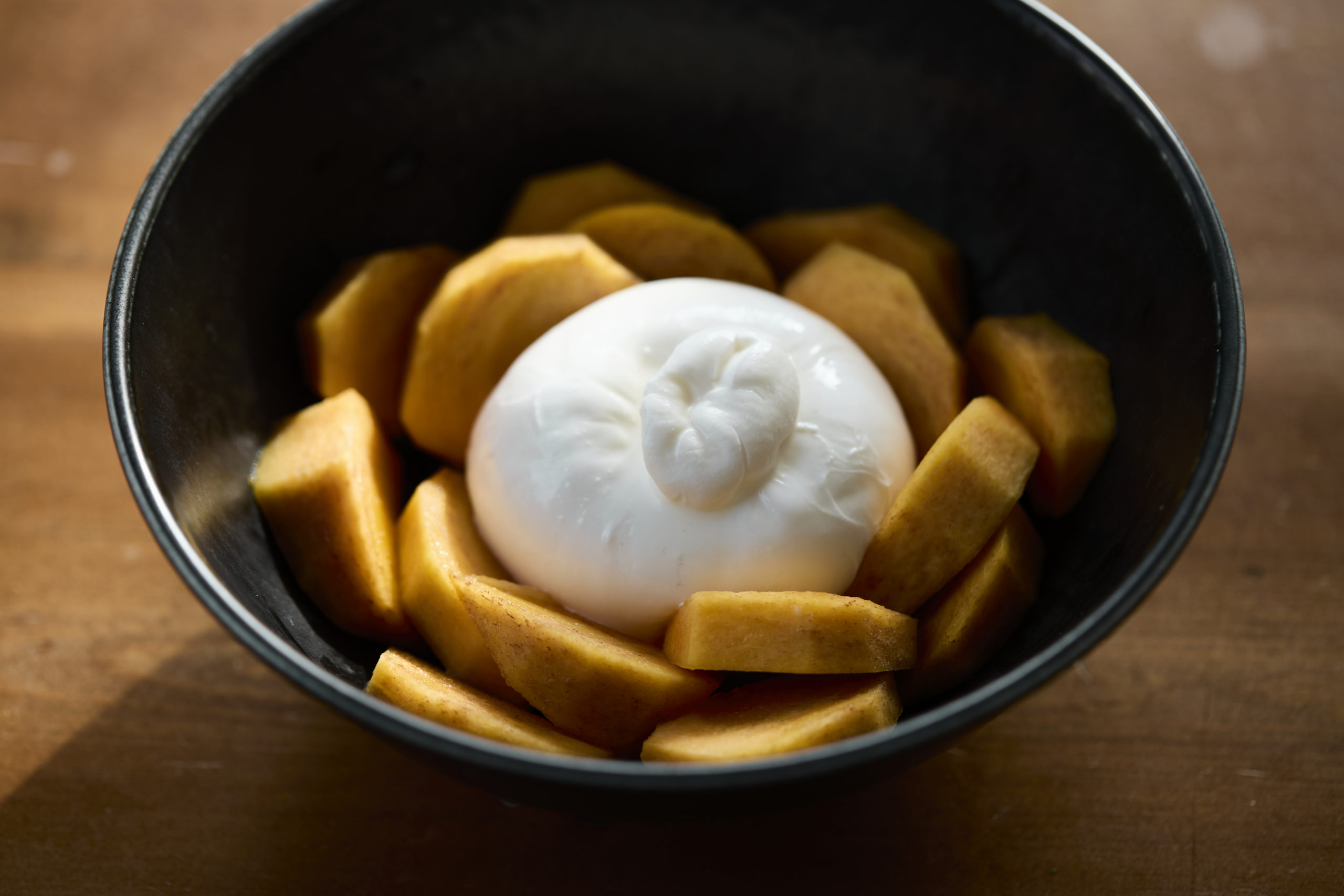 「ブラータ」は、モッツァレラチーズで作った巾着の中に、生クリームと細かく裂いたモッツァレラをたっぷりと詰め込んだ、フレッシュチーズです。ナイフを入れると、中から濃厚なクリームがとろりと溢れ出します。ミルク本来の甘みと、クリーミーな口どけをぜひお楽しみください。